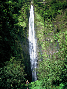 On the north side of Maui tour a rain forest valley of pools and waterfalls. Hike one mile (round trip) to two pools and waterfalls of 10 and 20 feet high. It's a fun spot to play, a beautiful place to visit. Swimming is optional, but it's terrific fun to swim under the waterfalls or climb a banyan tree and jump into a deep pool. The rain forest can be dark and mysterious; the pools sunny and refreshing.