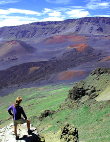 Grandeur, majesty, vastness. Haleakala's energy is intense and ethereal, and it's absolutely silent. We'd never visit Maui without experiencing the Crater. It's where our guides go for inspiration. A great amphitheater of silence and expansiveness. A place of beauty that always evokes awe. The four-mile trip is a good Crater sampler -- we hike through three very different environments with views stretching for more than a hundred miles in all directions. We hike two miles at the 8,000-foot level through native alpine scrub forest on a lava rock trail where most of the plants are rare, endemic species. We then hike another two miles at 10,000 feet along a sandy cinder path called Sliding Sands Trail, a route famous for its panorama of giant cinder cones, each one colored in the rose-orange-tan hues of the desert. An extra for those interested in endemic birds: we can do a half-mile loop trail at 7,000 feet through Hosmer Grove, a temperate dry-land cloud forest.